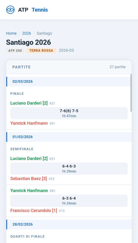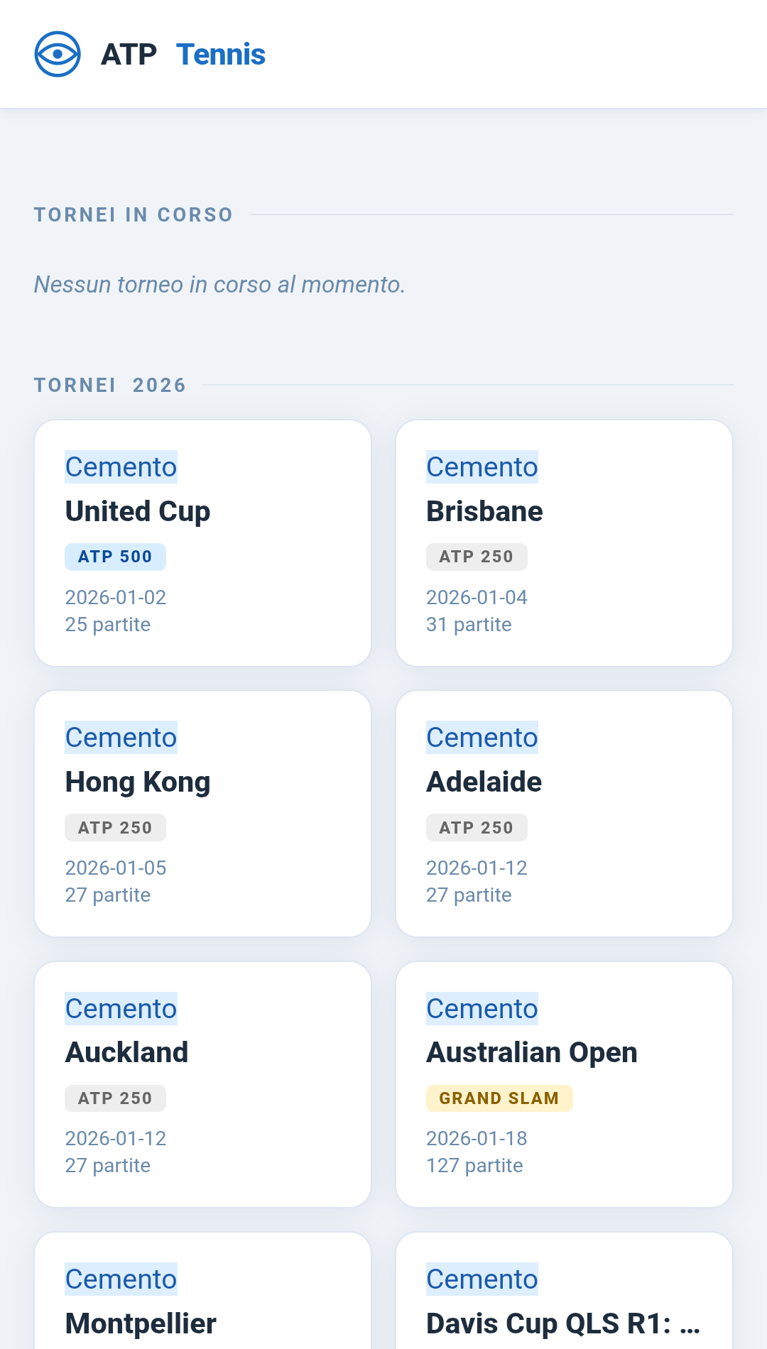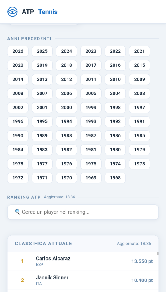 Progetto per la visualizzazione di tutti i tornei di Tennis ATP. Con i tornei in corso, di quest’anno e degli anni precedenti. In fondo alla home c’è anche la classifica.